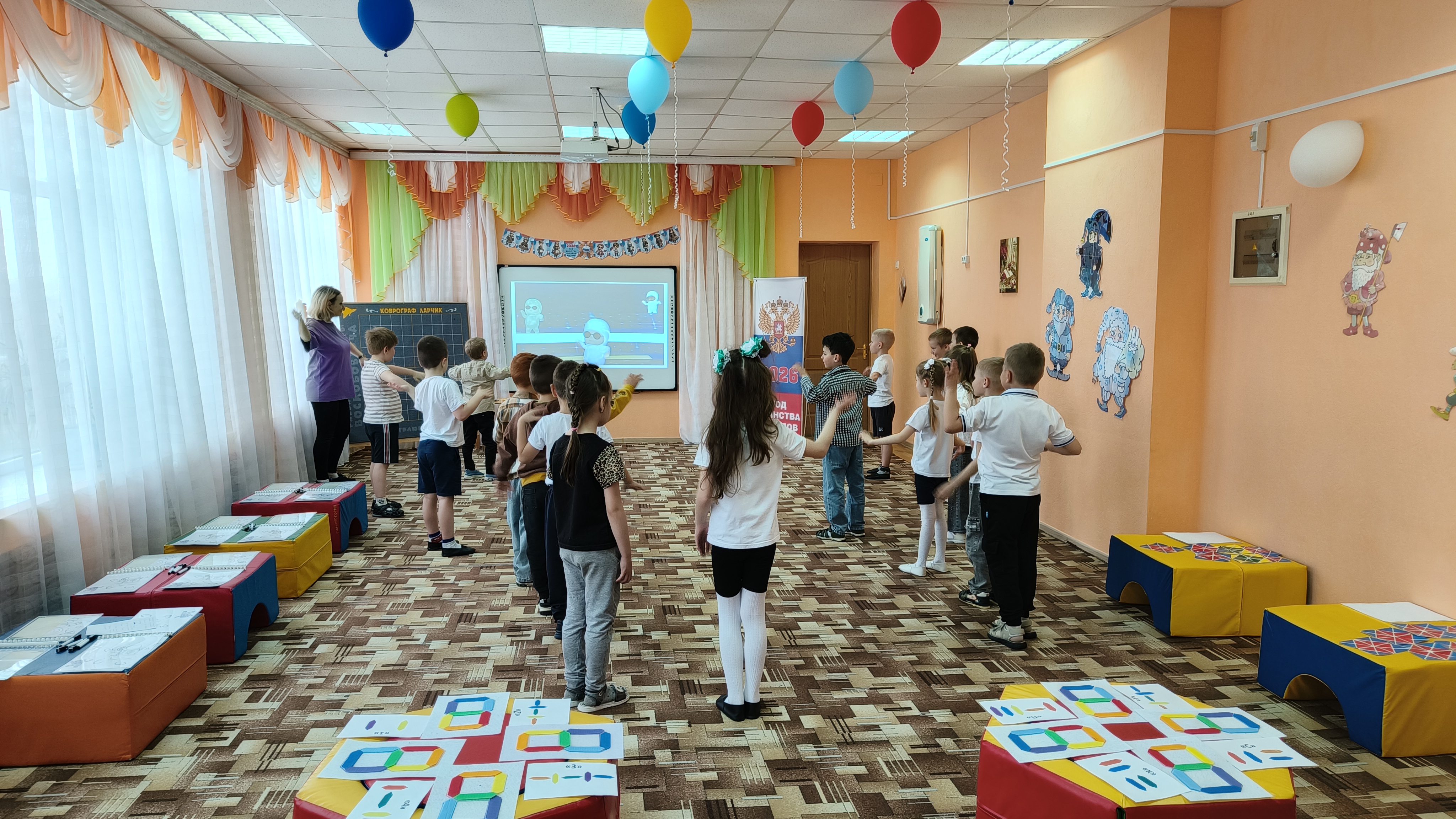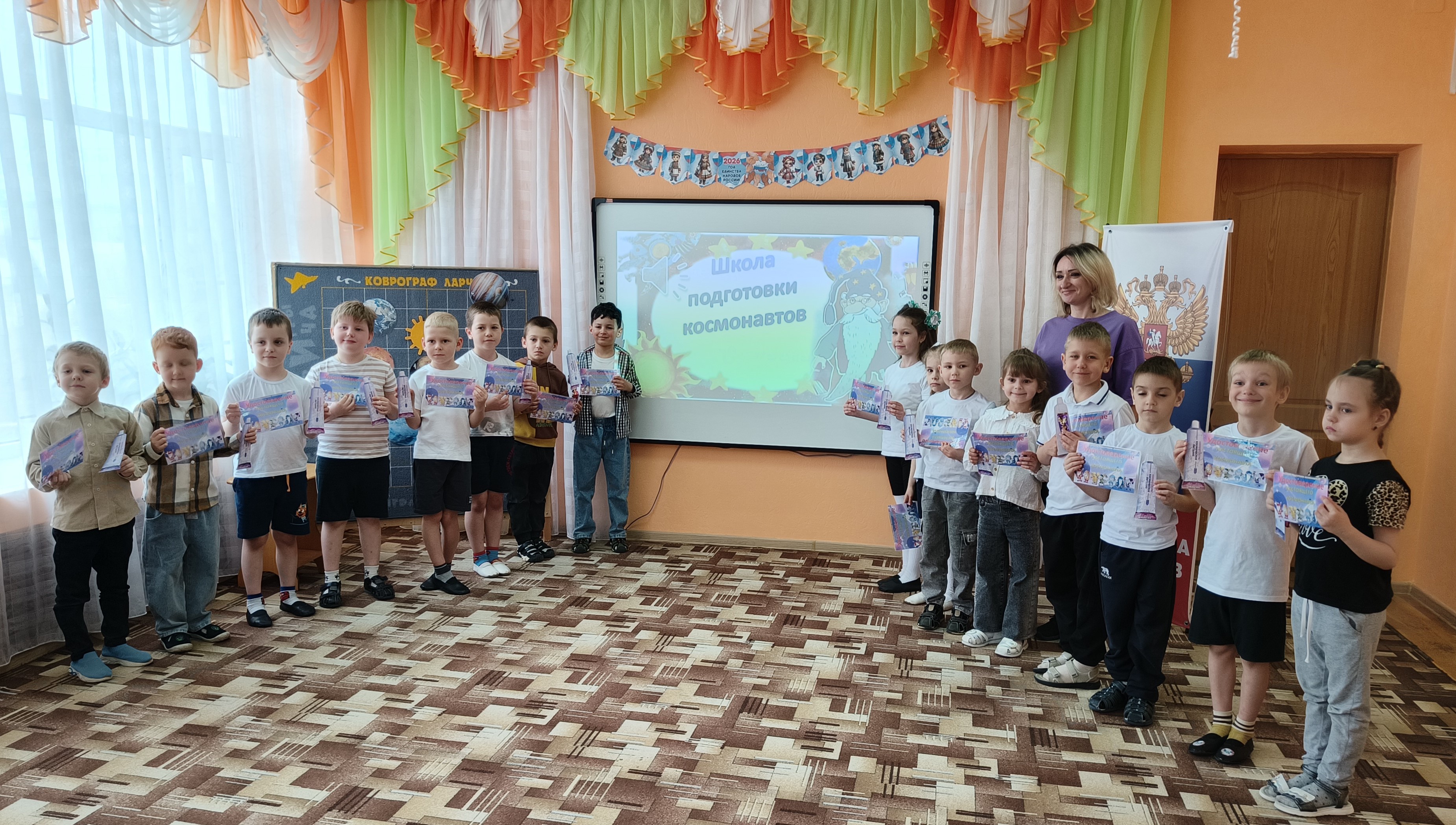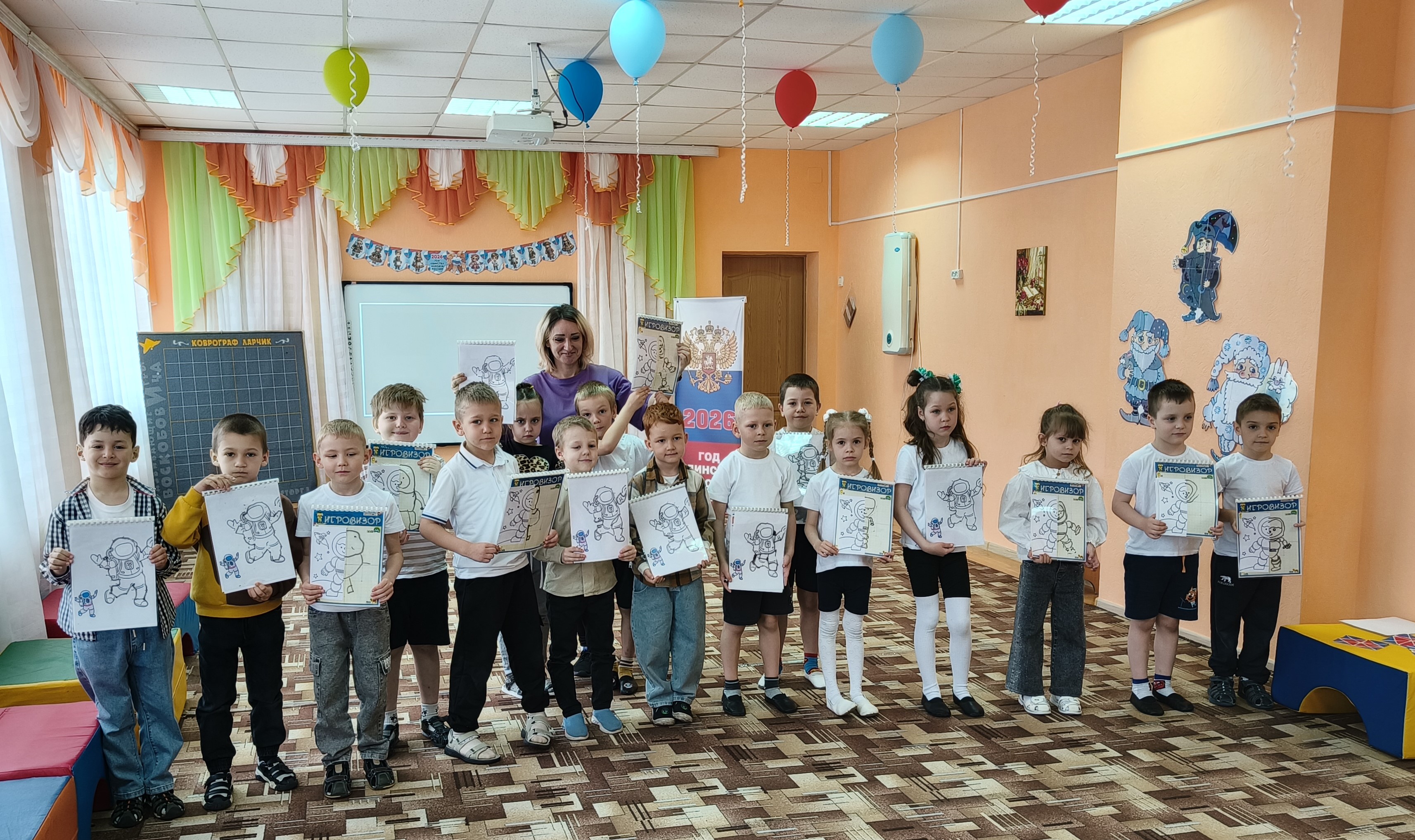 Физкультурно-познавательный досуг «Школа подготовки космонавтов». 10 апреля 2026 В рамках Всероссийской недели космоса воспитатель детского сада «Тополёк» Марина Перцева провела физкультурно-познавательный досуг «Школа подготовки космонавтов» с использованием развивающих игр В. В. Воскобовича. В мероприятии приняли участие воспитанники подготовительных групп детских садов «Ивушка» и «Тополёк». В ходе мероприятия детям было представлено игровое сюжетное сопровождение: обучение юных космонавтов организовано жителями Фиолетового леса — Радужными гномами. Воспитанники с интересом и высокой активностью выполняли предложенные задания: создавали «скафандр» с использованием «Игровизоров», расшифровывали фразу запуска ракеты на панно «Волшебные восьмёрки», конструировали ракету по образцу из «Волшебных квадратов», разгадывали тематические загадки, а также выкладывали на «Коврографе» планеты Солнечной системы. В программу досуга были включены музыкальные разминки, способствующие поддержанию двигательной активности детей. По завершении мероприятия всем участникам были вручены «космическое питание» и «удостоверения настоящих космонавтов».
