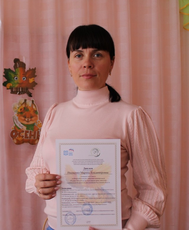 Победа в Областном конкурсе минутных видеороликов, посвященных 85-летию со дня основания Ростовской области «Родная Донская земля, ты в сердце моем навсегда» 05 ноября 2022 Старший воспитатель МБДОУ «Детский сад «Тополек» Иващенко Марина Владимировна приняла участие в областном конкурсе минутных видеороликов, посвященных 85-летию со дня основания Ростовской области «Родная Донская земля, ты в сердце моем навсегда», который организовали депутат Государственной Думы ФС РФ Тутова Лариса Николаевна, Автономная некоммерческая организация «Медиаграмотность в информационном мире», Южно-Российское отделение Ассоциации кинообразования и медиапедагогики РФ при поддержке Таганрогского педагогического института им. А. П. Чехова. В конкурсе приняли участие 130 конкурсантов, каждый из которых передал в своих видеороликах неповторимость и индивидуальность авторского восприятия родного края. По итогам конкурса старший воспитатель Иващенко Марина Владимировна заняла 1 место.