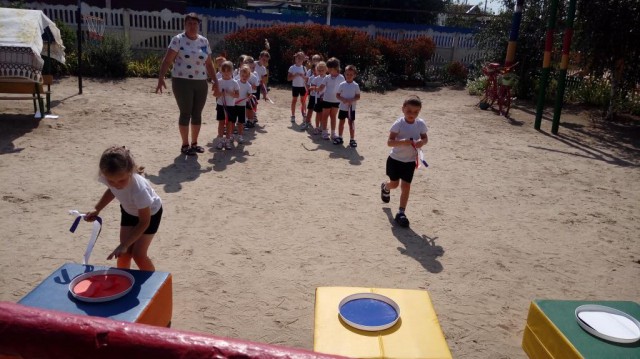 Спортивное развлечение «Веселые старты под флагом России» 19 августа 2023 В рамках календаря образовательных событий, в преддверии Дня Государственного флага Российской Федерации воспитатели Юлия Кочетова и Татьяна Новожилова провели спортивное развлечение «Веселые старты под флагом России» с детьми старшей группы «Солнышко». Цель: воспитание любви и уважения к своей Родине, создание праздничного настроения. Дети читали стихи, играли в дидактические игры, отгадывали загадки, соревновались в эстафетах, приняли участие в танцевальном флешмобе «Триколор». Педагоги организовали выставку творческих работ детей «Под флагом единым великой державы». Итогом развлечения стало рисование мелом на асфальте Флага России.