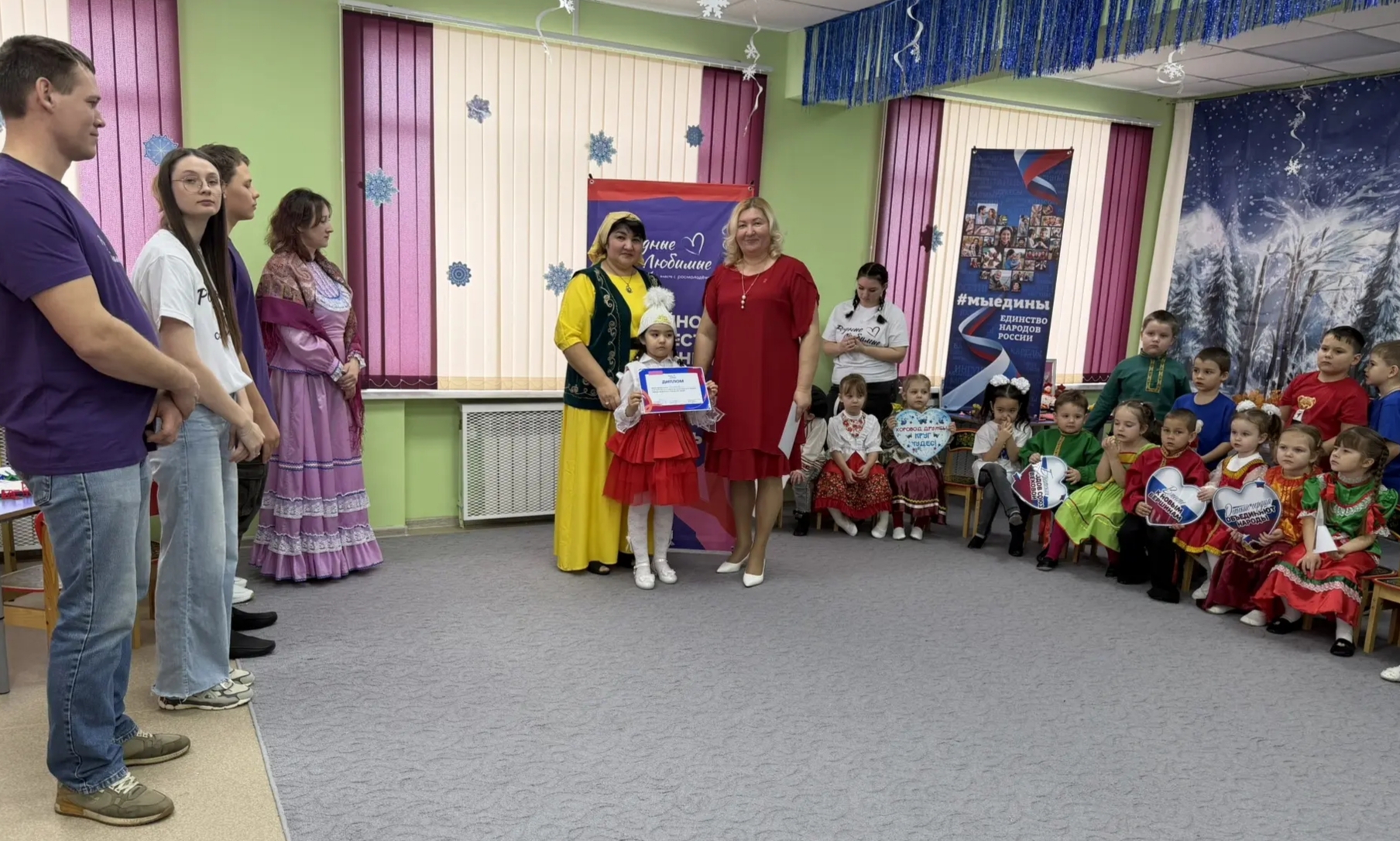 В МБДОУ «Детский сад „Сказка“» 20 января 2026 года состоялось открытие «Года единства народов России» 23 января 2026 В МБДОУ «Детский сад „Сказка“» 20 января 2026 года состоялось открытие «Года единства народов России», проведённое в формате Семейного фестиваля творчества. Торжественная часть мероприятия началась с исполнения гимна Российской Федерации. В рамках фестиваля были подведены итоги «Года защитника Отечества» и минутой молчания почтена память погибших героев СВО. В ходе мероприятия семьи и педагоги продемонстрировали своё мастерство в различных видах народного искусства: изобразительном и декоративно-прикладном творчестве, кулинарии, театральной и музыкальной деятельности. Для участников были организованы творческие мастерские, где дети и родители совместно создавали куклы «Народы России», художественные работы, инсталляции, а также «дерево семейных ценностей». Воспитанники старшей группы представили танцевальную композицию «Мы вместе». Фестиваль стал значимым культурным событием, объединившим детей, родителей и педагогов в атмосфере сотрудничества и уважения к традициям народов России. Все участники получили массу положительных эмоций и заряд вдохновения на новые творческие свершения. Фестиваль способствовал укреплению семейных традиций, развитию творческих способностей и межпоколенческого взаимодействия. Мероприятие завершилось награждением участников дипломами.